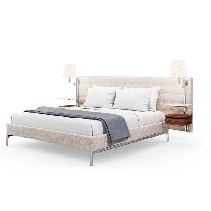 Eine Hotelsuite im Schlafzimmer. Das Volage EX-S Night Bett spielt die Hauptrolle im Konzept von Philippe Starck, das die private Zone in eine zu erkundende Insel verwandelt, bereichert durch die Möbel einer Suite, komplett mit einem Sessel und einem Sofa. Volage EX-S Night verwandelt Ruhe und Wohlbefinden in ein sinnliches Erlebnis zeitloser Eleganz. Das anspruchsvolle gepolsterte Kopfteil ist mit Capitonné-Knöpfen verziert und kann mit Steckdosen ausgestattet werden. Die eleganten Stäbe sind mit Holz- oder Marmorböden ausgestattet, die als Nachttische dienen und mit Tischlampen und dimmbaren Lesespots komplettiert sind. Der gepolsterte Bettrahmen ist kompatibel mit dem Breath®-reinigenden Stoff, der ersten patentierten Technologie zur Luftreinigung ohne Stromquelle, mit null Emissionen, die Schadstoffe einfängt und abbaut, die natürliche Zirkulation von sauberer Luft fördert, um einen sicheren, gesunden Lebensraum zu schaffen. Die Polsterung besteht aus recyceltem PET-Faserflies.