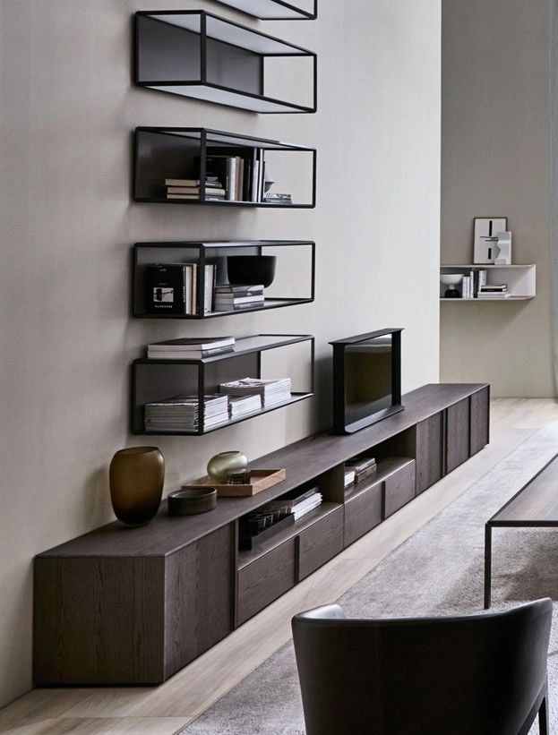 Grado° wurde von Ron Gilad entworfen, der für den Compasso D’Oro Award 2014 nominiert wurde. Eine neue Ergänzung dieser Kollektion ist das Grado° Bücherregal, ein schwebendes Element mit einem markanten 45°-Abschnitt, das einfach zu verwenden ist, um beeindruckende schwebende Bücherregale zu schaffen. Die Gewissheiten der klassischen Kollektion sind denen gewidmet, die Tradition und Strenge lieben, und für sie gibt es diese Walnussversion.