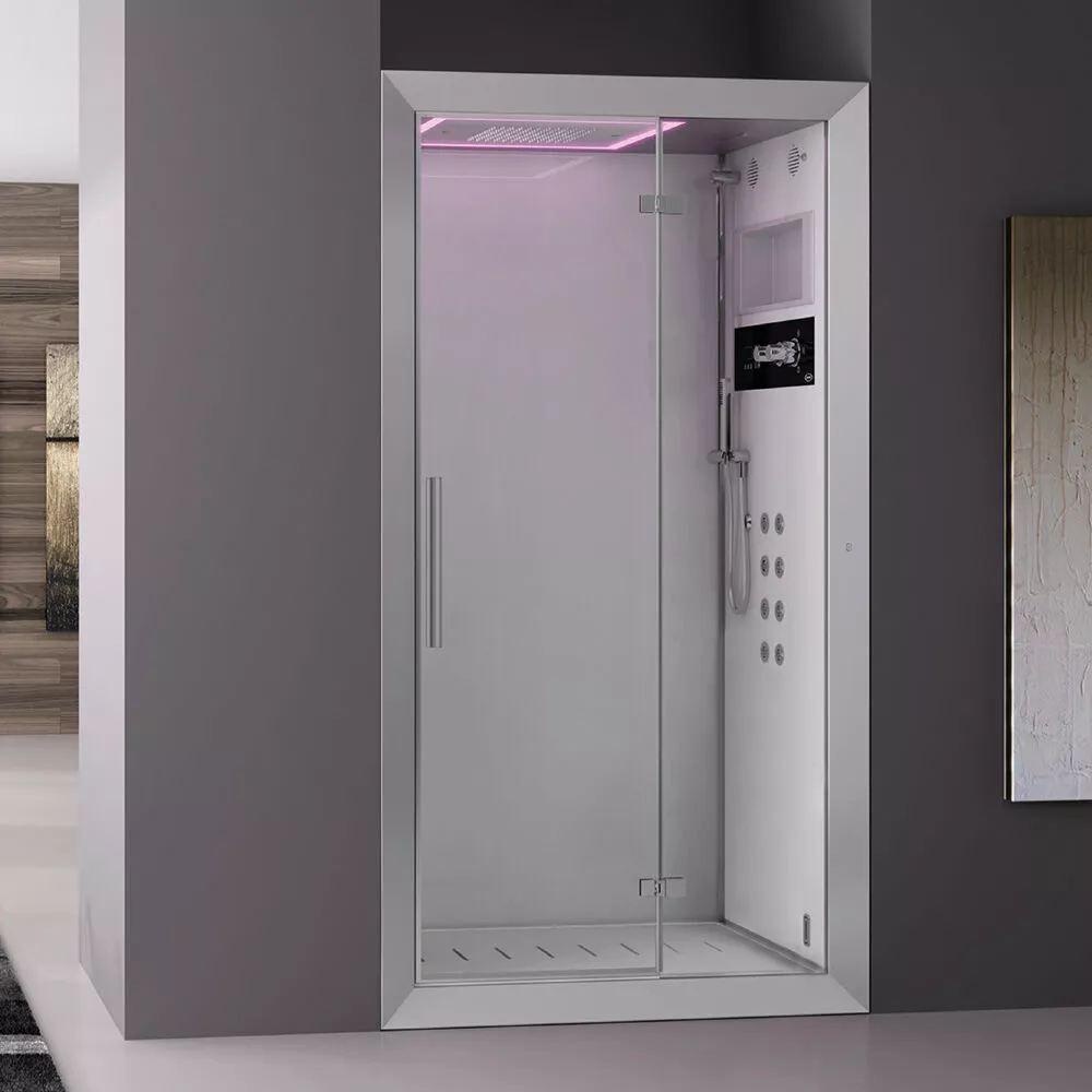 Die verborgene Technologie und die raffinierte Ästhetik einer neuen Art, das Duschen zu erleben - einer, die umfassend, befriedigend und fesselnd ist - werden in einer exklusiven Umgebung präsentiert. Die Jacuzzi®-Düsen bieten Ihnen die Möglichkeit, verschiedene Arten von Hydromassage auszuwählen. Mit dem Zubehör können Sie zwischen drei Optionen wählen: Nacken- und Lendenmassage, bei der die Düsen die verspanntesten Punkte Ihres Rückens massieren; die effektive, tiefe Shiatsu-Massage mit ihren Tonic- und Relax-Programmen; und die sequenzielle Massage, bei der Sie Ihre bevorzugte Geschwindigkeit wählen können. Das Jacuzzi® Cromodream® ermöglicht es Ihnen, aus 6 Grundfarbtönen zu wählen, die direkt mit dem Wasser auf Ihren Körper verteilt werden. Die Energie von Rot, die Brillanz von Gelb, die Reinheit von Weiß, die Gelassenheit von Grün und die Intensität von Blau können auch zu 4 verschiedenen Farbzyklen werden: dies sind wahre Wellness-Programme. Von Designer Mario Ferrarini stammt das Setting für das Jacuzzi® Frame, mit seiner Liebe zum Detail, der essentiellen Ästhetik und der Wahl von naturnahen Materialien, die angenehm zu berühren sind und das sinnliche Erlebnis noch intensiver machen können. Überschreiten Sie die Schwelle in einen kontinuierlichen konzeptionellen Raum, um an vorderster Front des Wohlbefindens einzutreten. Der Jacuzzi® Touch Screen ermöglicht Ihnen den Zugriff auf alle Funktionen der Dusche, des Türkischen Bades und der Hydromassage mit einer einzigen Berührung; ein einzigartiges elektronisches Steuerungssystem vereint jede Funktion auf einer einfachen, intuitiven Bedienoberfläche.