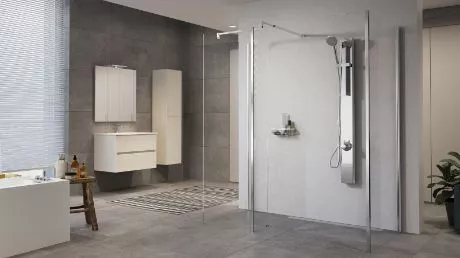 Novellinis Revif-Linie moderner Duschkabinen ergänzt verschiedene Badezimmerstile mühelos. Die Linie verkörpert zeitgenössisches Design und Funktionalität und bietet eine schicke und nützliche Lösung für ein stilvolles Duscherlebnis. AUSGESTATTETES PANEL AUS EDELSTAHL, ZUR WANDMONTAGE