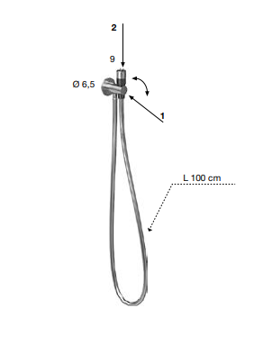 Hygienische Handbrause aus satiniertem Edelstahl mit Wasseröffnung (2), integr. Sicherungsschließung (1) und flexiblem Schlauch 100 cm, mit Sprühnebel-Wasserstrahl..Delivery: 8-12 weeks