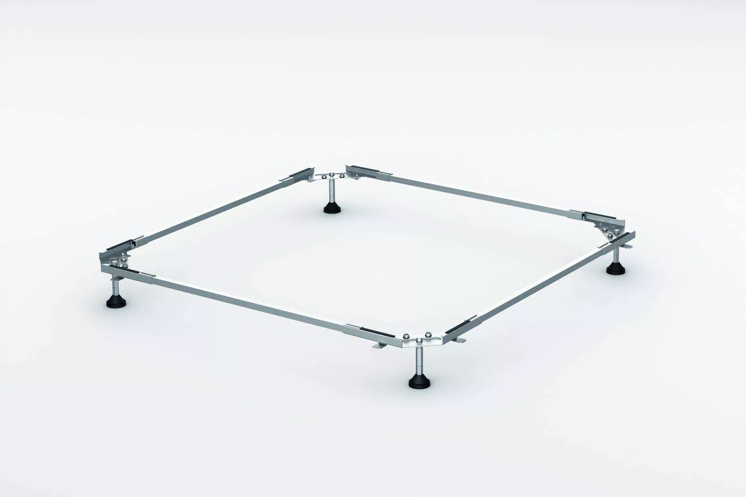 Schnellere, sicherere und kostengünstigere Installation von Duschwannen. Die höhenverstellbaren Beine werden in einen Rahmen unter dem Rand der Badewanne geschraubt. Dadurch wird die Last beim Duschen gleichmäßig auf den gesamten Rahmen verteilt. Es ist nicht mehr erforderlich, die Duschwanne zu unterfüttern.