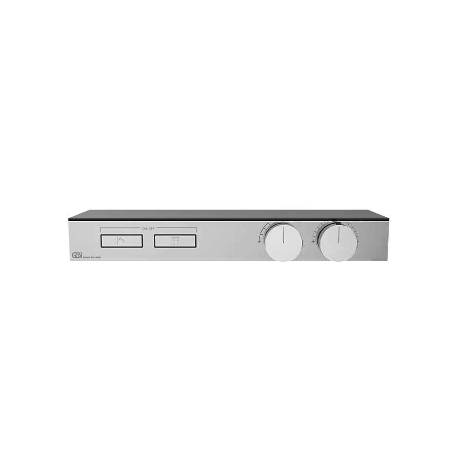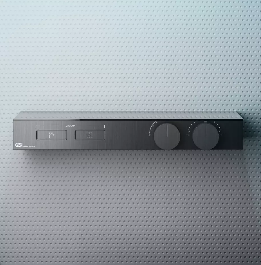 Externe Teile für Thermostatregal-Mischer für zwei separate Funktionen, mit Ein-/Aus-Tasten. Regal aus schwarzem satiniertem Sicherheitsglas. Hi-Fi, die neueste Kreation von Gessi, ist die neue Grenze ihres Private Wellness®-Programms. Der ikonische Name dieser Kollektion umreißt die Inspiration, die aus der Geschichte der akustischen Ingenieurkunst für High-Fidelity-Stereosysteme stammt. Gessi Hi-Fi geht weit über bloße Ästhetik hinaus und bietet High-Fidelity-Technologie für Wasser, studierte Ergonomie und funktionale Perfektion. Die präzisen Bedienelemente wurden entwickelt, um alle taktilen Empfindungen von Stereoanlagen vergangener Zeiten nachzubilden: Das Klicken auf leicht hervorstehende Funktionstasten vermittelt dieses typische alte Gefühl, das Tickern der Knöpfe, die millimetergenaue Präzision der Bedienelemente ermöglichen es, die bevorzugte Regelung von Durchfluss und Temperatur einzustellen und beizubehalten.