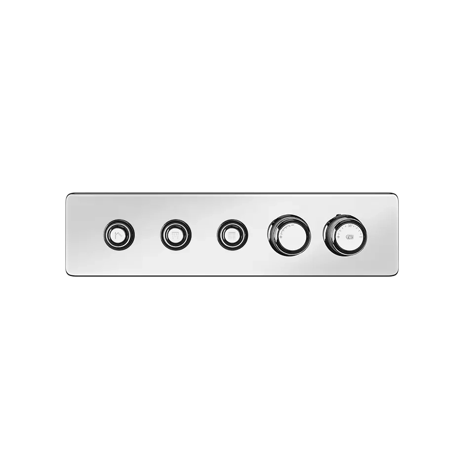 Externer Teil für Thermostatmischer für drei gleichzeitige Funktionen, mit Ein-/Aus-Tasten. Hi-Fi Eclectic ist eine Weiterentwicklung des ursprünglichen Hi-Fi-Konzepts: eine hochwertige multifunktionale Duschsteuerung mit Formen und Merkmalen, die uns an die Bedienfelder, Grafiken, Tasten und Knöpfe der High-Fidelity-Stereoanlagen erinnern, die einen tiefen Eindruck in der Geschichte von Design und Technologie hinterlassen haben.