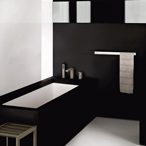 Handtuchhalter mit 60 cm Abstand. Die unveränderten freistehenden, wandmontierten und deckenmontierten Rettangolo-Armaturen, Badezimmeraccessoires und andere Produkte mit ihrer Vielzahl von Modellen, Versionen und koordinierten modularen Elementen ebneten den Weg zur vollkommenen Freiheit bei der Gestaltung des Badezimmers. Jeder Hausbesitzer konnte endlich die Einrichtung nach seinem eigenen Geschmack abstimmen und wurde zum wahren Schöpfer seines Wohnraums.