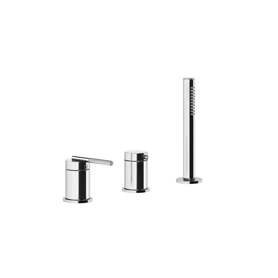 Drei-Loch-Badewannenmischer mit Umsteller, 1,50 m flexiblem Schlauch und antikalk Handbrause. Zur Verwendung mit Überlauf-Füllung. Ingranaggio ist ein Spiel aus ineinandergreifenden Mechanismen, kostbar und aktuell, geeignet für jede stilistische Lösung. Das Badezimmer ist der Raum, in dem wir Energie tanken, die sich auf uns selbst bezieht, und unseren archaischen Teil zurückfordern. Die Ingranaggio-Kollektion zeichnet sich durch die dünnen röhrenförmigen Linien des Auslaufs aus, die sich am Ende biegen und mit dem Körper kreuzen, der durch den Schnitt eines niedrigen und integrierten Griffs unterbrochen wird, auf dem der röhrenförmige Hebel ruht, der in zwei Teile geteilt ist und mit einer zarten linearen Verzierung verziert ist. Das Konzept der Linearität wird durch die extra-schlanken Proportionen betont, die auf allen Elementen wiedergegeben werden