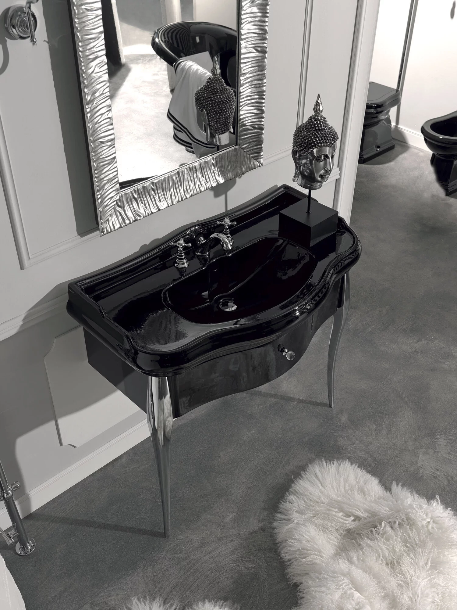 Der Charme der Vergangenheit inspiriert die gesamte Kollektion. Mit weichen und nostalgischen Formen entwickelt sich die Retro-Kollektion zu modernsten technischen Lösungen, die perfekt für das Badezimmer-Interieur-Design sind. Von Badezimmerarmaturen bis zur Dekoration, von Möbeln bis zu Badewannen, diese Kollektion umfasst auch Badezimmerzubehör.