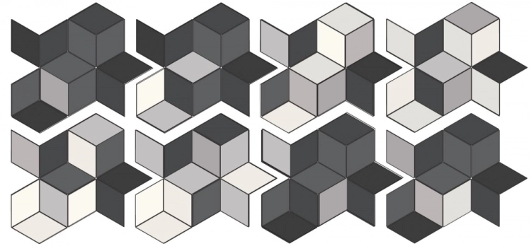 - Die Info the image schematically represents the item of 162×70 cm composed of 8 modules 35×40.4 cm each. the tiles are available in three colors, each of which contains three shades.