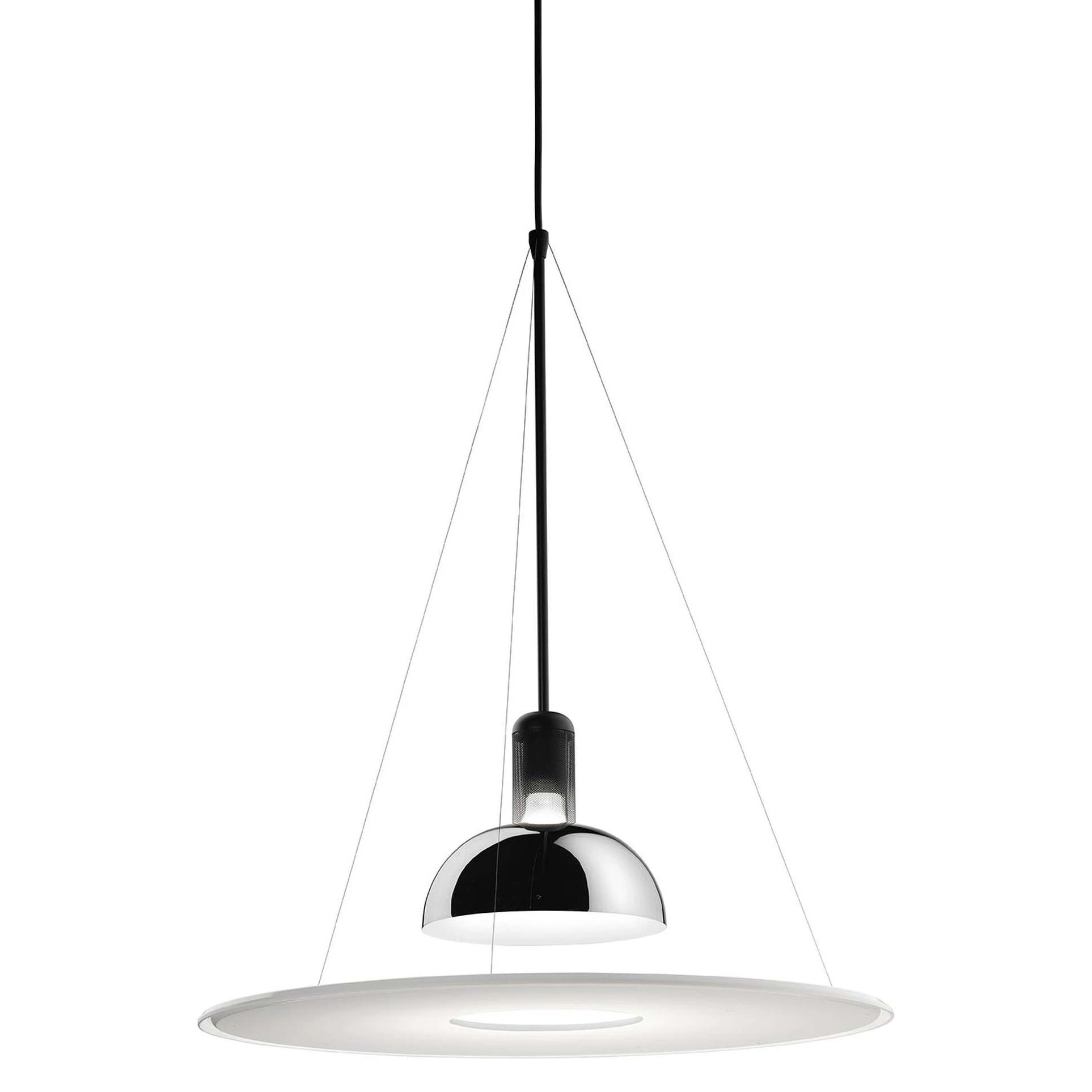 Hängelampe mit direktem, diffusen und reflektiertem Licht. Opaline Polymethylmethacrylat (PMMA) spritzgegossene Diffusorplatte, die von drei feinen Stahlseilen aufgehängt wird. Polierter, vernickelter und zaponlackierter gestanzter Blechreflektor, innen glänzend weiß lackiert. Schwarz lackierte, spritzgegossene ABS-Deckenbefestigung und -rosette.