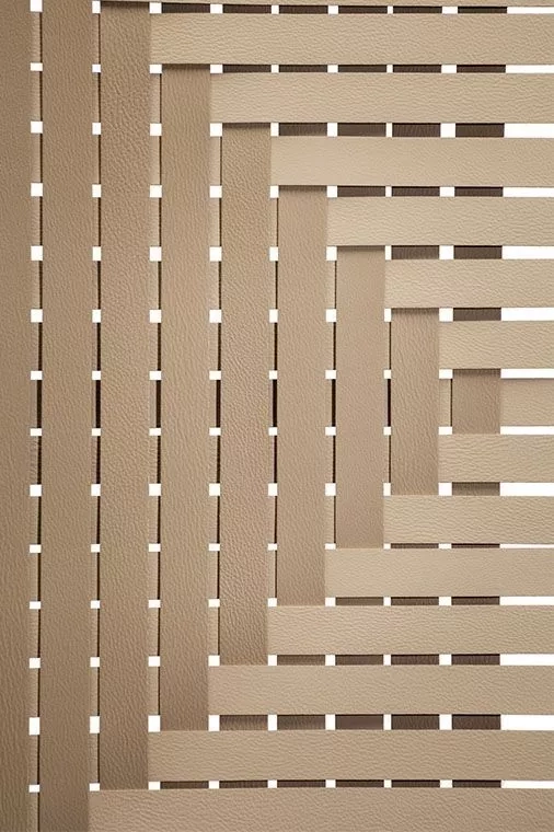 Der Plot-Raumteiler ist in zwei, drei oder vier Modulen erhältlich. Die Struktur besteht aus Aluminiumrohren, die mit einem Moka-Eschen-Finish furniert sind. Die vertikalen und horizontalen Rohre sind mit Metallverbindungen mit matt messingfarbenem Finish verbunden. Die konischen Kappen unten, ebenfalls aus Metall, sind lackiert. Die Struktur wird von Metallfüßen mit matt bronzefarbenem Finish getragen. Die gewebten Bänder, die an die Metallrohre gehakt sind, bestehen aus Pelle Frau® ColorSphere® mit vordefinierten Farbkombinationen. Die möglichen Farbkombinationen zwischen den vertikalen und horizontalen Bändern sind: - Pelle Frau® SC 26 Topo / Pelle Frau® SC 28 Seppia - Pelle Frau® SC 44 Noisette / Pelle Frau® SC 42 Maquillage - Pelle Frau® SC 44 Noisette / Pelle Frau® SC 99 Carrubo - Pelle Frau® SC 66 India / Pelle Frau® SC 67 Chiodi di garofano - Pelle Frau® SC 173 Glauco / Pelle Frau® SC 180 Celadon - Pelle Frau® SC 248 Iris / Pelle Frau® SC 99 Carrubo