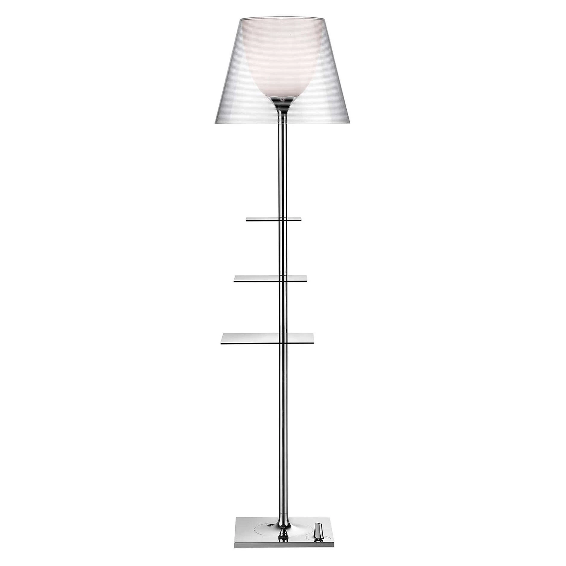 Stehlampe mit diffuses Licht. Basis, Stange und Diffusor-Ständer aus verchromtem Druckguss-Zink. Basisabdeckung aus verzinktem P04-Stahlblech. Innerer Diffusor und Lampenhalter-Ständer aus opalfarbenem Spritzguss-PC. Die äußeren Diffusoren sind in passendem PVC-Stoff, Spritzguss-Methacrylat mit klarer oder rauchgrauer Oberfläche oder in Silber oder Bronze auf der Innenseite durch Vakuum-Aluminiumbeschichtung erhältlich. Oberer Ring aus klarem Spritzguss-PC. Halterungen aus poliertem Edelstahl. Eine USB-Steckdose an der Basis ermöglicht das Aufladen der gängigsten Smartphones und Tablets (max. 2A).