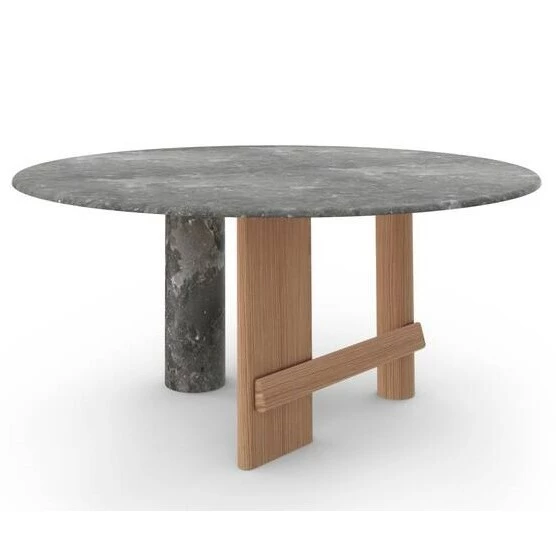 Der Sengu-Tisch ist ein nahezu monumentales Möbelstück, das die Geselligkeit durch poetischen Dialog feiert und den Schwerpunkt auf die Vereinigung verschiedener Materialien legt, die zusammen eine große visuelle Taktilität ausdrücken. Der ovale und runde Tisch zeichnet sich durch eine massive Holzstruktur mit einem ovalen Bein aus, das durch ein oder zwei Querstreben mit den zwei zylindrischen Beinen verbunden ist. Die Oberseite besteht aus der gleichen Holzessenz wie die Struktur - Canaletto-Walnuss, Natur- oder schwarz gebeizte Eiche - oder ist kombiniert mit einem zylindrischen Säulenelement von starker Präsenz, erhältlich in einer Auswahl von Marmor und farbigen Keramiken. Es ist auch möglich, der runden Version einen Lazy Susan aus emaillierter Keramik hinzuzufügen; diese drehbare Oberseite ist ein weiterer wichtiger Verweis auf die Traditionen des Orients.