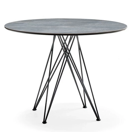 Bistrot-Tisch mit Graphit (GFM69), weißer (GFM71) oder schwarzer (GFM73) geprägter lackierter Stahlbasis. Marmi Alabastro (KM02), Ardesia (KM04), Emperador (KM10), Makalu (KM11) oder Arenal (KM13) Keramikplatte oben.