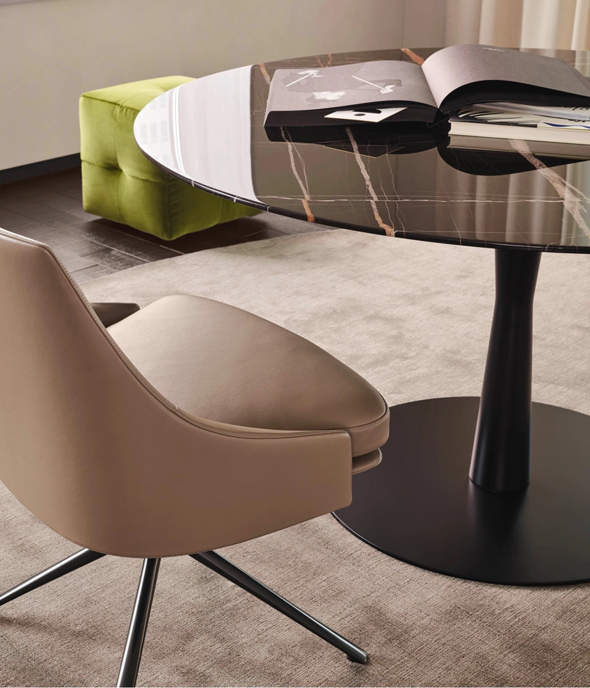 Flute ist ein kleiner Tisch für die intimsten Anlässe. Er interpretiert eine klassische Designform mit Persönlichkeit, indem er die dünne und saubere Basis wie die eines Stielglases mit einer runden Tischplatte kombiniert, die mit allen verfügbaren Oberflächen von matten und glänzenden Lacken bis hin zu Marmor individuell gestaltet werden kann.