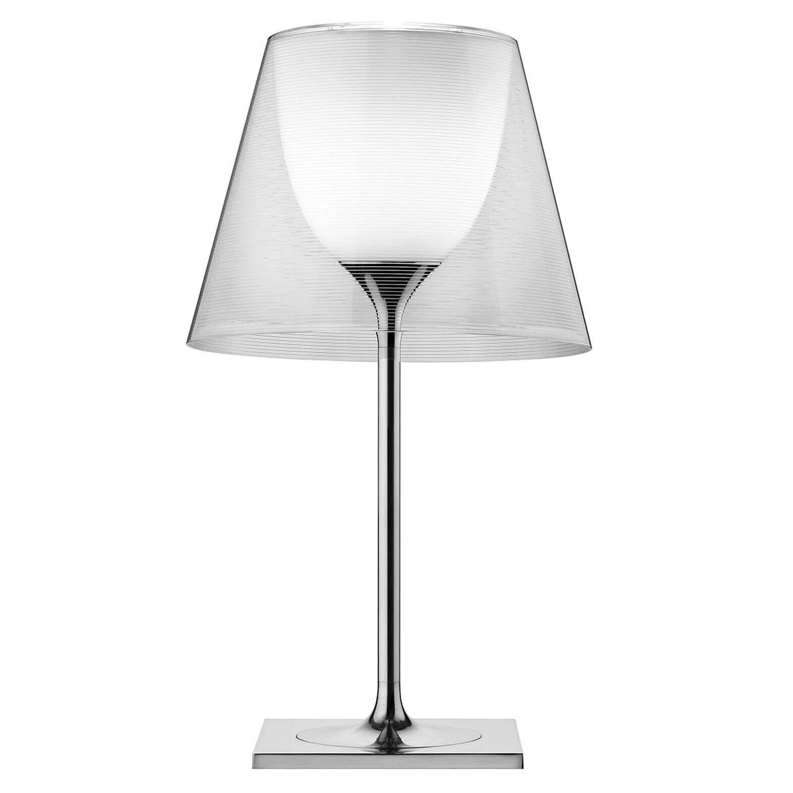Tischleuchte mit diffuser Beleuchtung. Basis, Stützstange und Diffusorhalter aus Druckguss, poliert und verchromt Zamak-Legierung. Basisabdeckung aus schwarzem spritzgegossenem PA (Nylon). Spritzgegossener PC (Polycarbonat) opaler Innendiffusor. Äußere Diffusoren aus transparentem oder rauchigem PMMA (Polymethylmethacrylat) und Silber oder Bronze auf der Innenseite, durch Vakuum-Aluminiumbeschichtung. Spritzgegossener PC (Polycarbonat) oberer Ring, komplett transparent oder transparenter Diffusor und silberner Diffusor) oder transparent braun für den äußeren bronzenen Diffusor.
