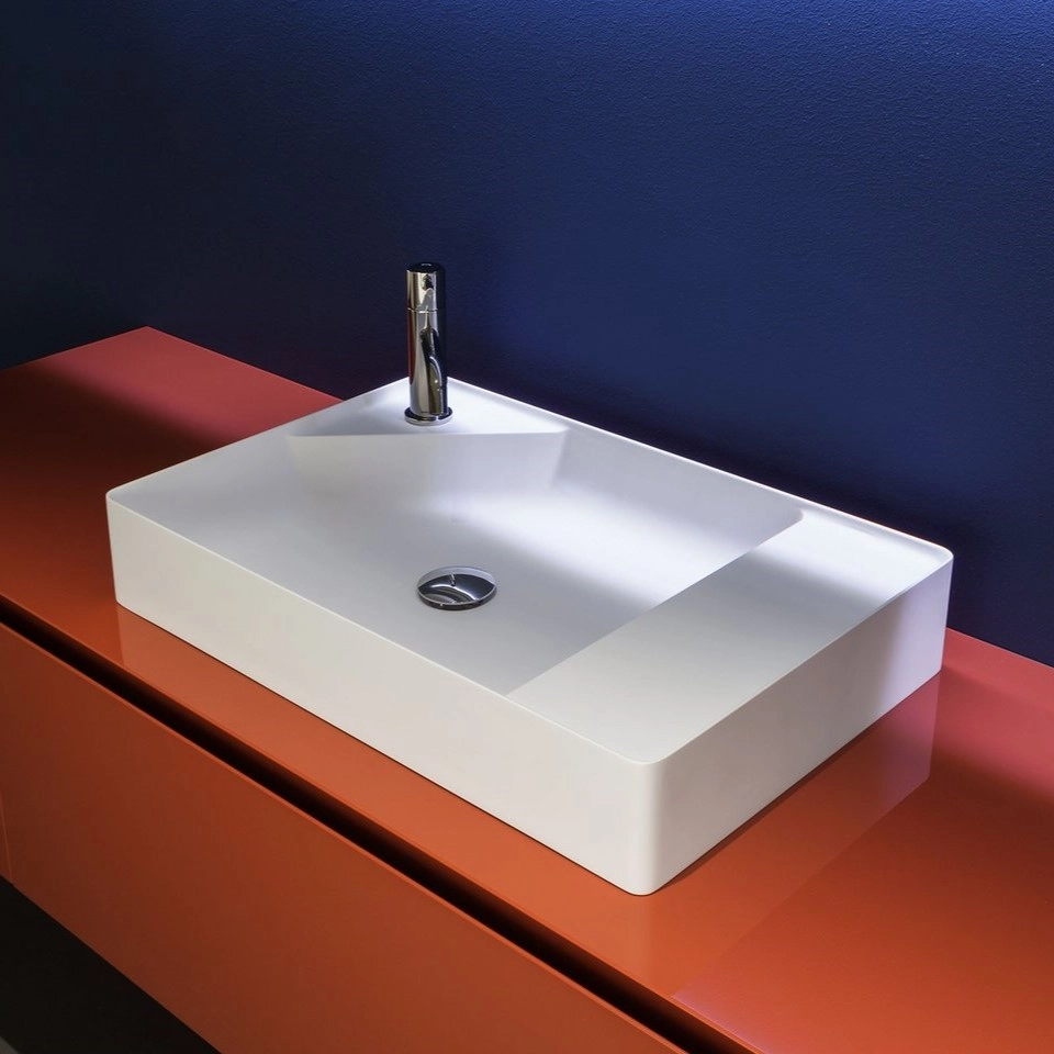 Rechteckiges Aufsatz- (A) oder Wandbecken (B) aus Flumood, inkl. nicht verschließbarer Ablaufgarnitur und Siphonverbindung. .Delivery: 8-12 weeks