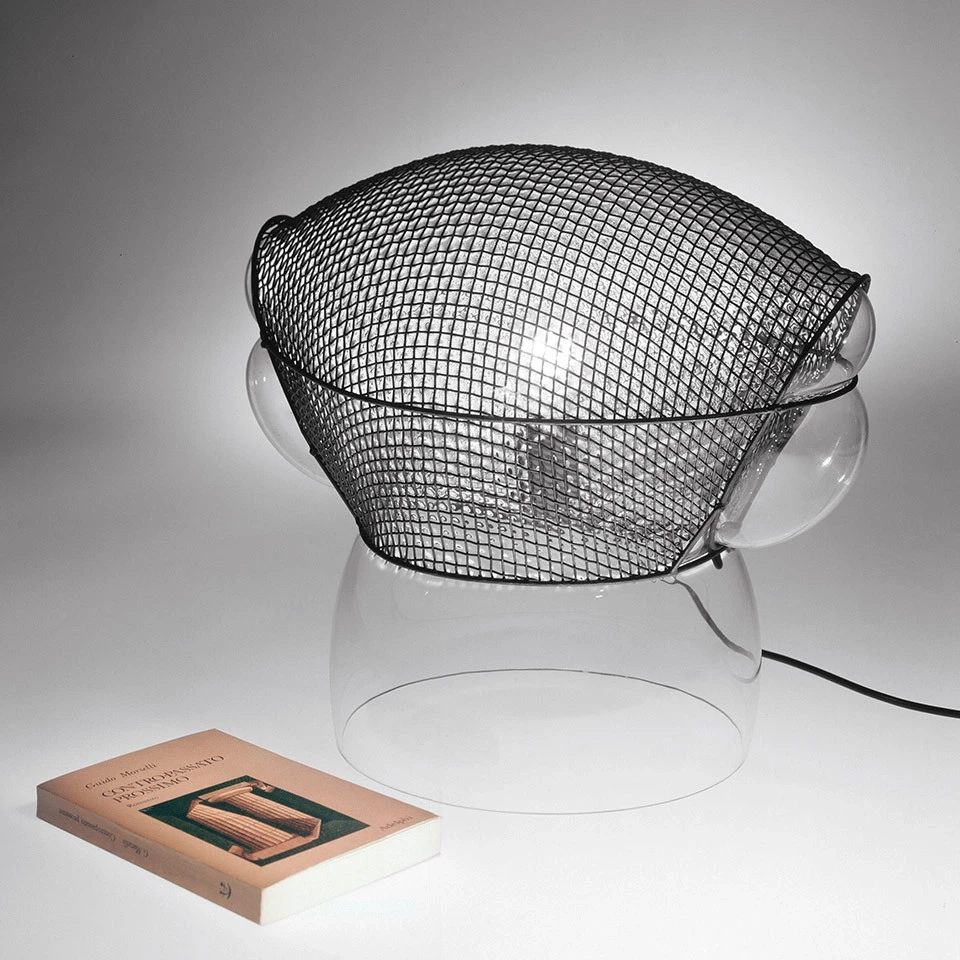 Body in transparent blown glass with the diffuser partially covered by an irregular rhomboid metal frame. The frame is created by welding steel wire that is resistant to the heat of the glass which is blown within the cage.