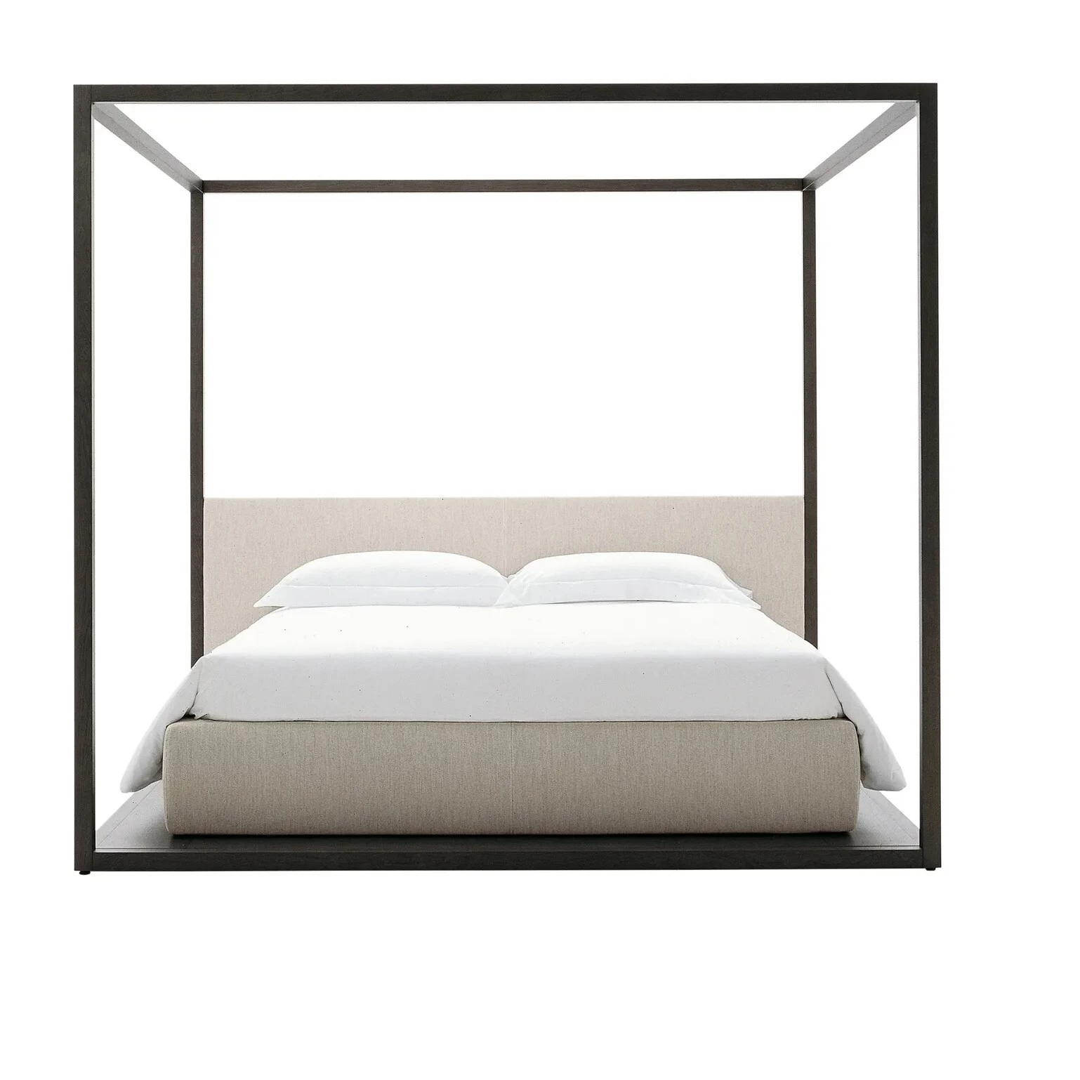 Alcova is the classical canopy bed in a modern interpretation, suitable to be positioned mid-room; bed sides and headboard in leather or fabric. The bed rests on a platform which is large enough to position a service element with an open compartment at the foot of the bed.
