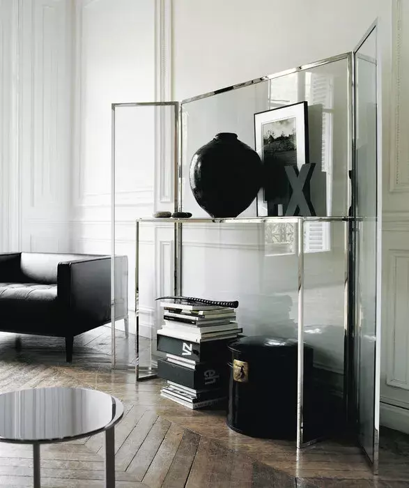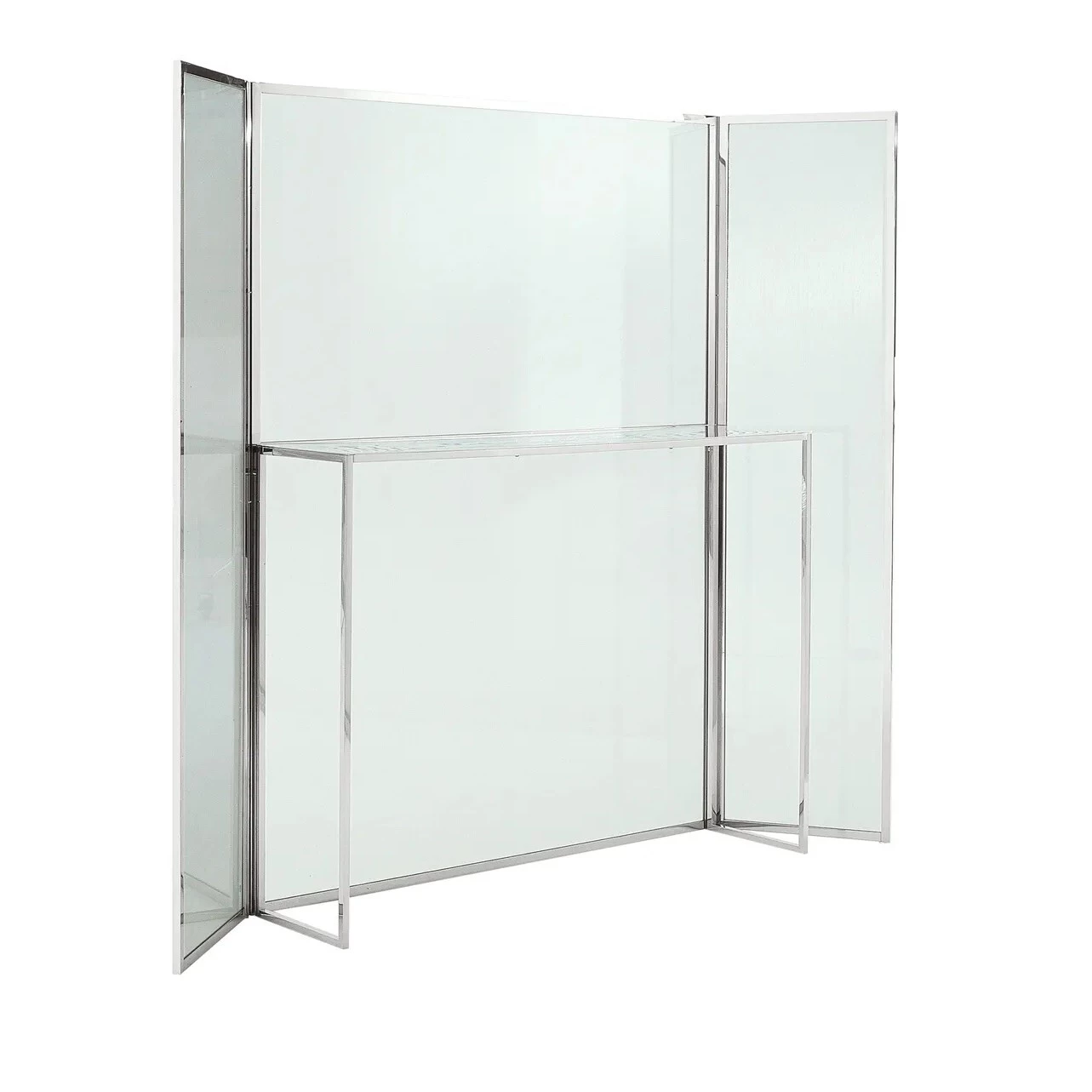 This unique windscreen-console has a bright chromed steel and brass frame, and is made up of a central panel equipped with a shelf and doors of glass veiled by the thin stainless steel mesh it is bonded with the glass. It functions as a console, as well as a room partition.