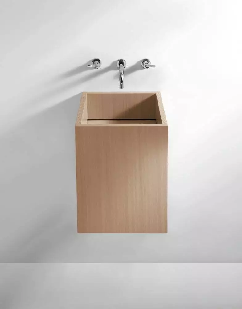 Square washbasin in waterproof birch plywood with natural, brown, dark oak or veneer or in reconstituited wood whit teak finish, without tap hole and overflow, complete with fixing kit. This washbasin comes fitted with the .MET0563 waste, which is already included in the price.