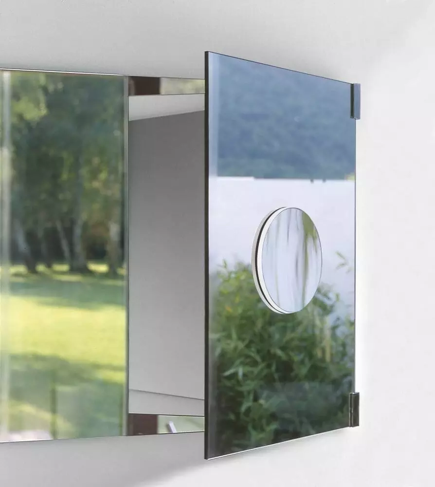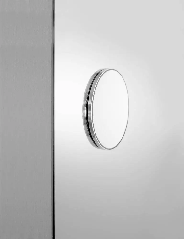 Round magnifying mirror with adhesive rear surface and chromed plastic frame. The mirror can be mounted on all smooth surfaces in the desired position. Magnifying power: 2. Minimum order quantity: 8 pieces. For smaller quantities, add 20% surcharge.