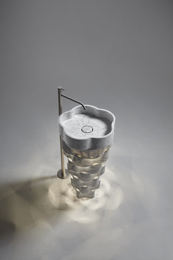 Freestanding stone sink with floor drainage with or without led lighting, complete with open plug, siphon, rigid hose and transformer for led version. Sink weight: 55 Kg approx. H 85.Delivery: 8-12 weeks