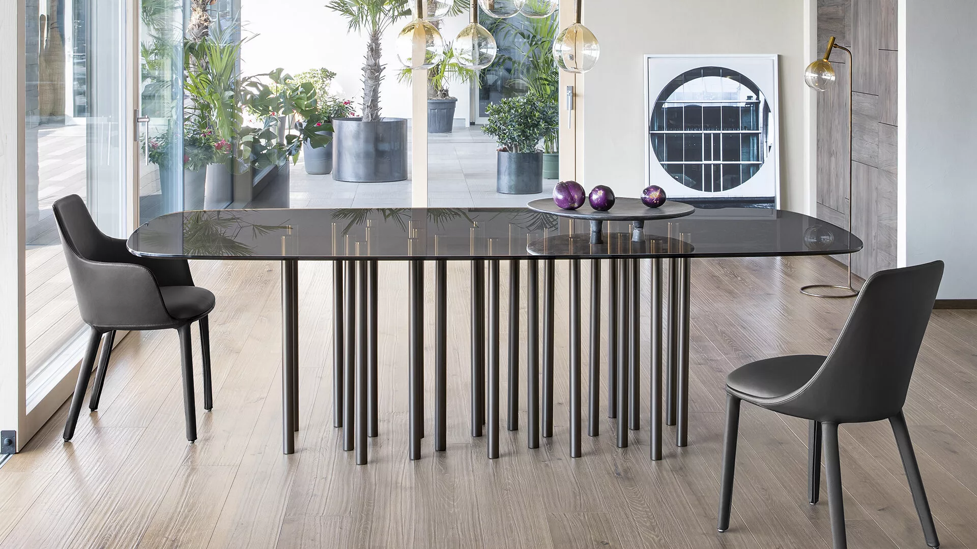 A design conceived to furnish and characterise the spaces,thanks to the transparency of the glass top combined with
