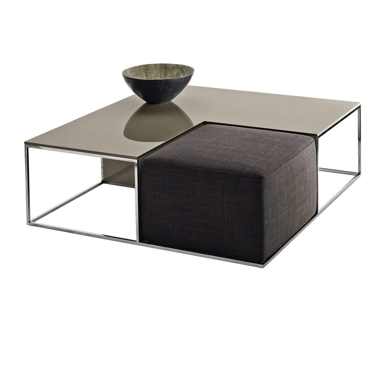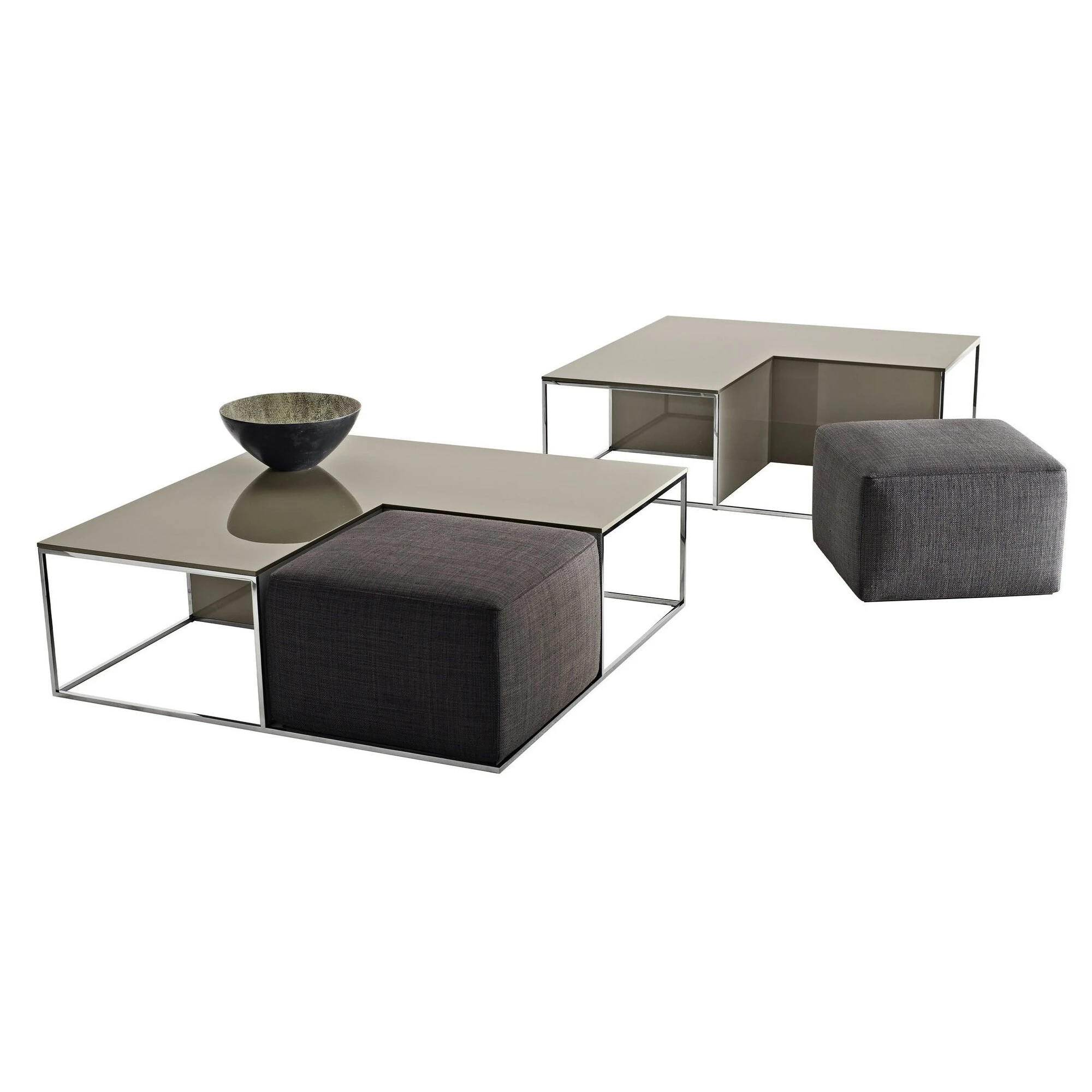 Low table to be used in the conversation area with the dual role of convenient surface and seat, by exploiting its soft portion. The small ottoman forms the set with a consistent graphic spirit.