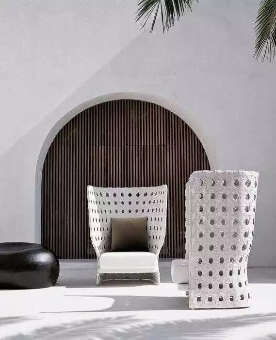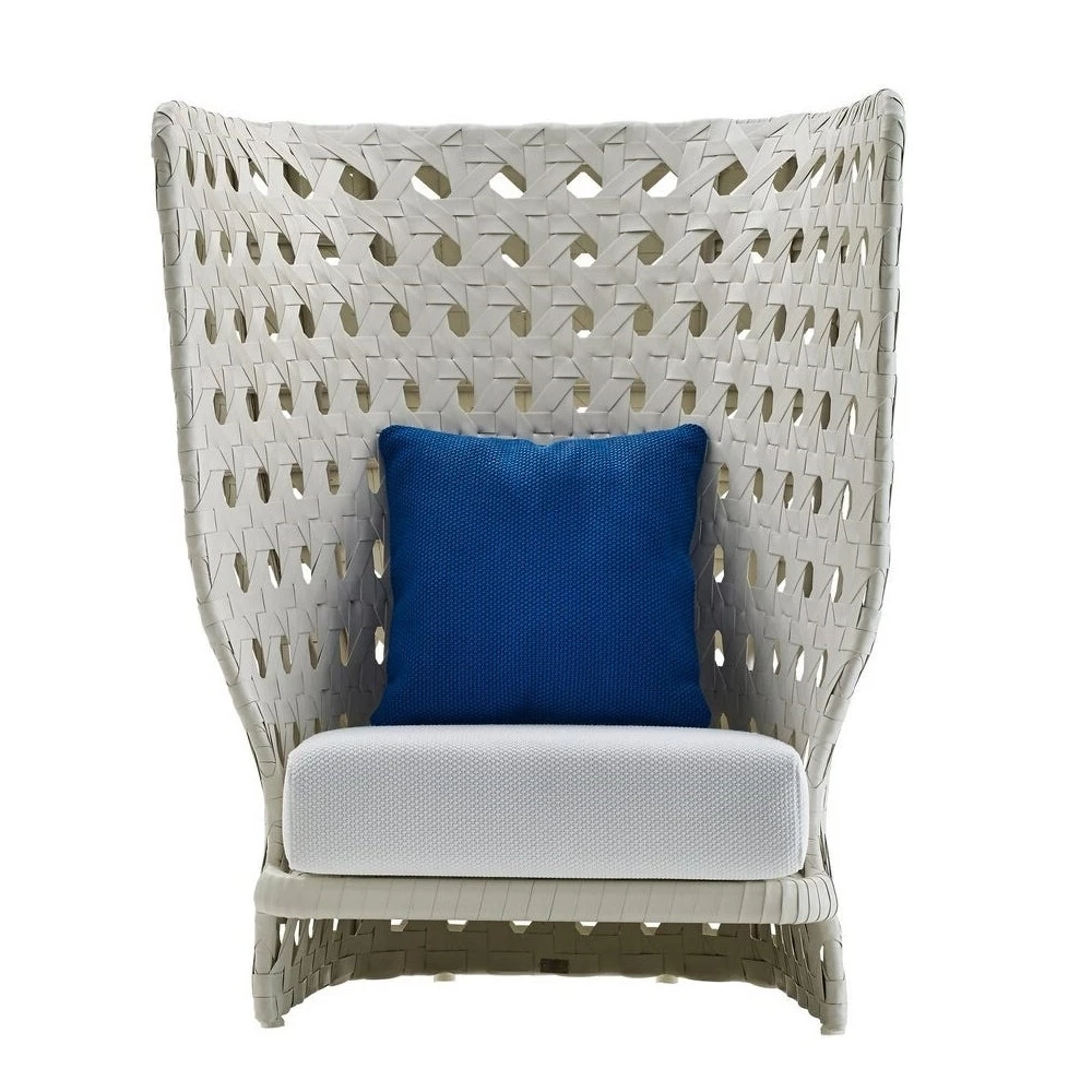 Vienna straw, with its geometric decorative pattern, is the inspiration behind Canasta, the Spanish term for basket. Enlarged to macro proportions, the design is applied to armchairs with a striking effect, available with a high or low backrest. Both are characterised by polyethylene fibre ribbons woven onto a powder-coated aluminium frame. Classic in style but with a contemporary sense of plasticity, Canasta is a hyper-decorative collection, ideal for use at the edge of a swimming pool or in a luxuriant garden. In addition to armchairs, the family also includes sofas, tables, small tables, and other furnishings.