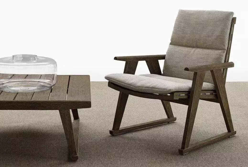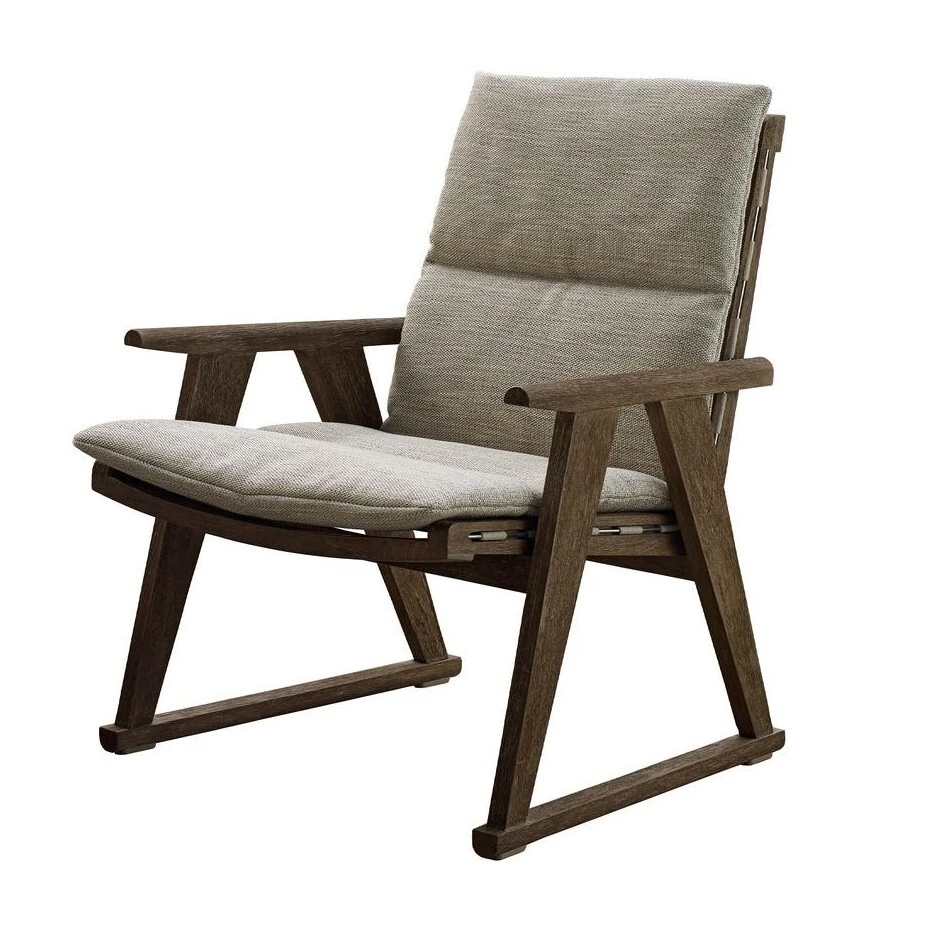 The Gio armchair is dedicated to living in the open air, included in a collection with a contemporary classic accent designed by Antonio Citterio, which developed from solid teak structures with a special antique grey finish, which gives the wood a particular lived-in aspect and silver-grey reflective quality. To ensure a better insulation from the weather, all the padded elements have a polyester cover with waterproof treatment, and the fabrics are certified for resistance to weathering, UV rays, chlorine and sea spray.