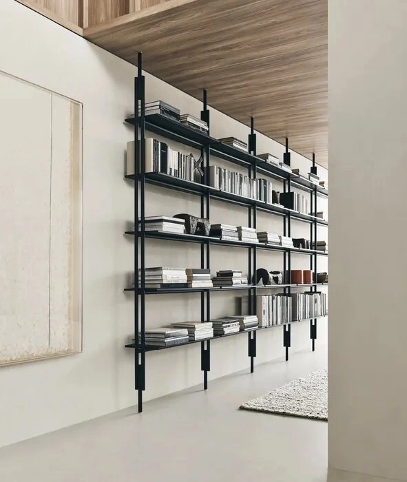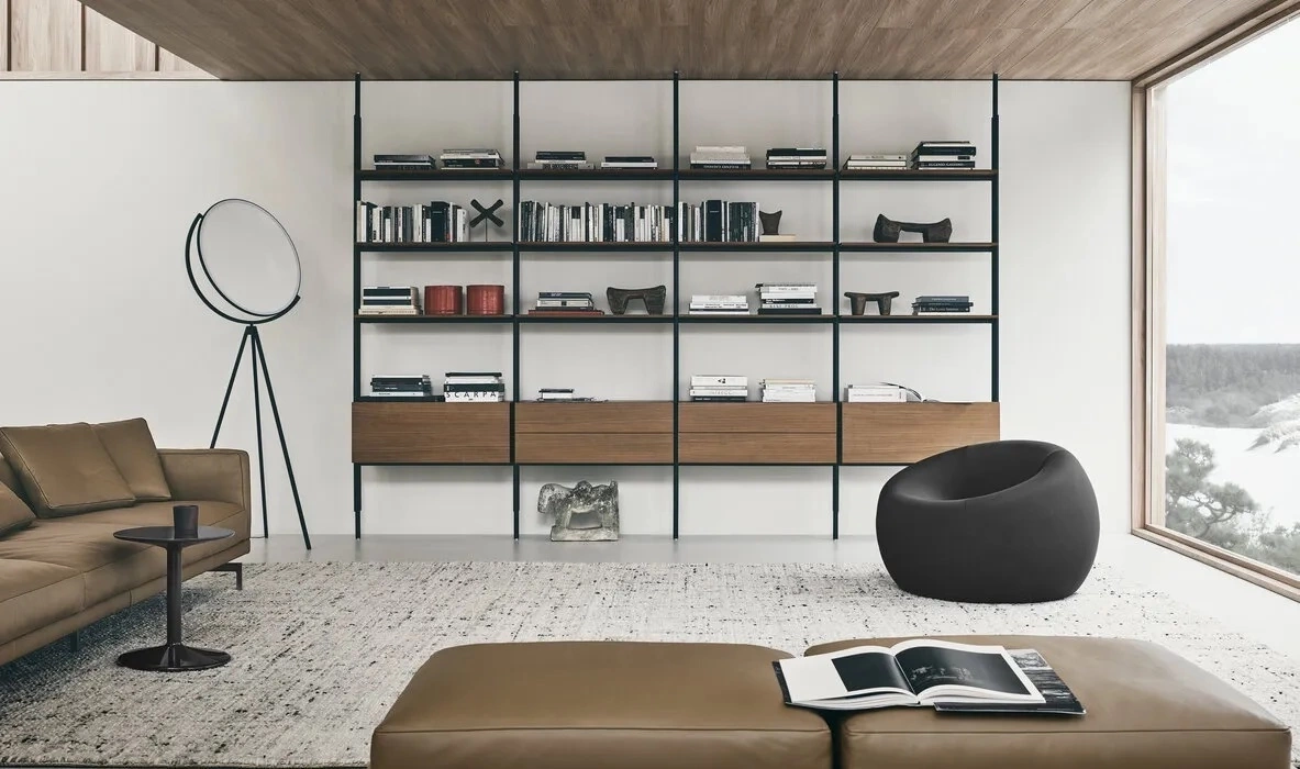 Classic yet contemporary, essential yet extremely flexible, the Jack wall system is offered in two versions: with vertical floor to ceiling uprights, or with rods to be fixed to the wall. The modularity and discrete technical solutions underlying the project make it possible to create compositions for every room and furnishing context. The system features numerous elements which can be combined to increase the system’s functionality. These include new, deeper shelves, storage elements such as drawers, and flap doors. From an aesthetic point of view, all the elements of the Jack wall system are available in two colours, to which Canaletto walnut and four oak finishes are added as an option for the shelves and storage units.