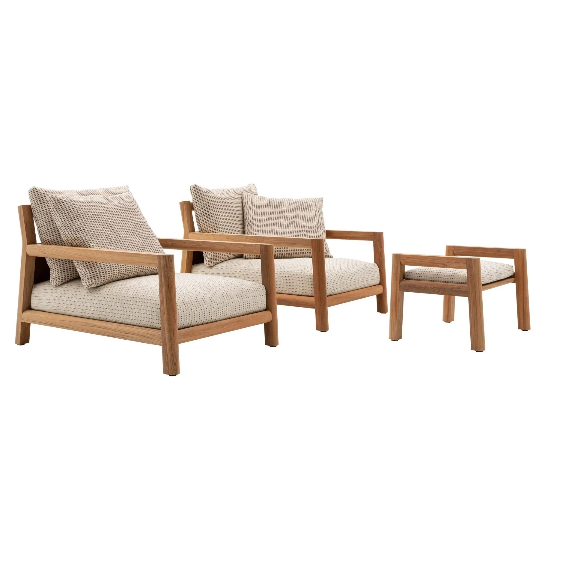 The Pablo armchair by Vincent Van Duysen, with its decisive design and innovative proportions, is available in an outdoor version, breathing life into a series that includes an armchair in two depths, sofa, and footrest. The soul of the original project lies in the wood frame, which for Pablo Outdoor is made of teak, the ideal material for outdoors. The geometry of the supporting frame presents a sophisticated balance of straight and curved lines, but this is not just an aesthetic choice. In fact, the frame, with its uninterrupted surface, was designed to ease maintenance of the wood, which is easy to treat as necessary. The rear fabric panels are anchored to rods that can be removed easily. This is also an aesthetic choice that meets a technical solution aimed at simplifying care for the wood and maintenance of the textile parts. These design expedients allow customers choosing the Pablo Outdoor collection to let it age naturally or have it returned its original condition. The continuity of the form and quality of the wood make Pablo Outdoor particularly pleasant to the touch. Comfort and softness are also found in the deep seat and back enhanced with cushions that can be arranged freely. The low seat is composed of a single generously upholstered cushion, nearly a mattress that creates an ample area perfect for isolating yourself or sharing moments of conviviality.
