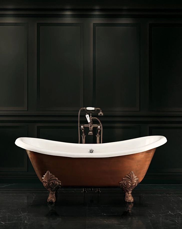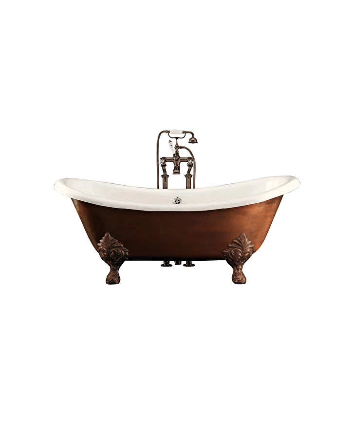 Precious copper reflections adorn The ritual of bathing which underline the retro design inspired by the late nineteenth-century French style. The double raised backrest guarantees a great comfortable seat. The bathtub is completed with the precious Flora feet having antique copper finish.