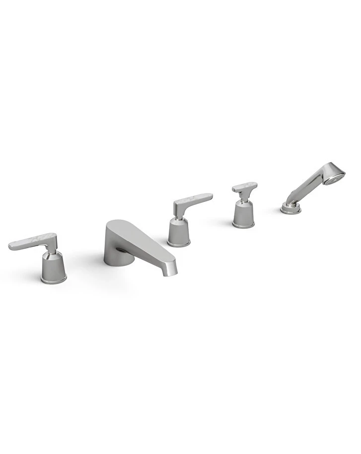 Ultra-sophisticated echoes of the 1920s shape the minimal and unmistakeable design of a 5-hole bathtub set, complete with spout, diverter and spray handset, designed in collaboration with Gensler. The simplicity of the shapes, the richness of the materials (such as the covers in precious Calacatta Oro marble) and the fine attention to detail make explicit reference to American Art Deco, reinterpreting it with an innovative, yet familiar style code.