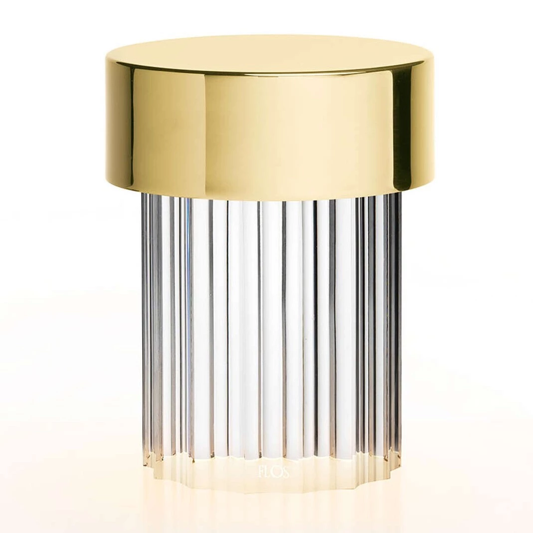 Flos Last Order table lamp was designed by M. Anastassiades. It is a rechargeable table lamp that diffuses light through a transparent solid crystal base whose shape makes reference to architectural typology of the ancient column. The top cover comes in a combination of different metal and colour finishes: stainless steel, brass, satin copper or green opal coating.