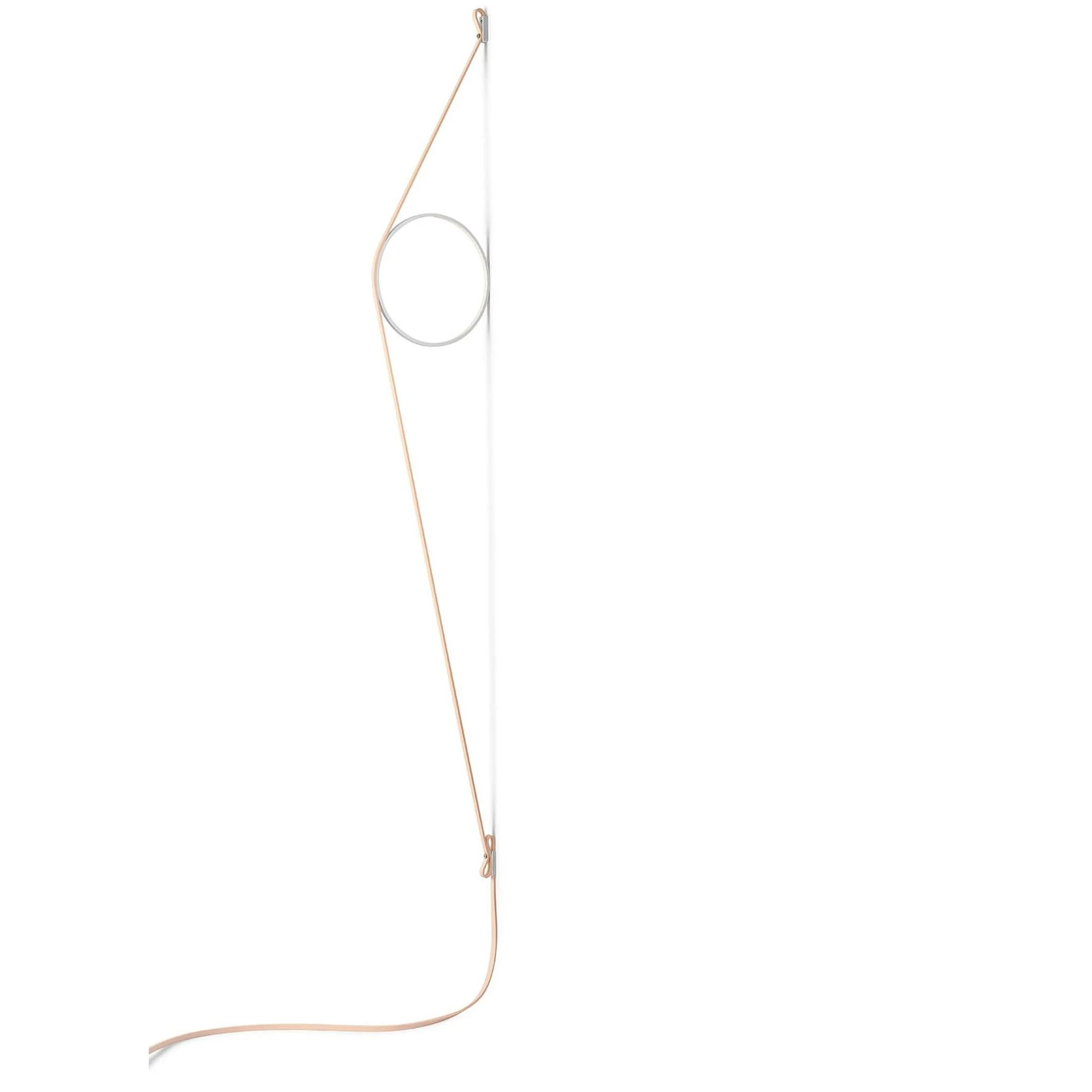 Indirect light wall lighting device with body in calendered, extruded aluminium with galvanised or varnished finish. The special tangent cable, in coloured rubber, provides the power. The cable is fixed to the wall with ABS joints in the same finish as the ring. Dimming via switch pedal on the cable. Power supply on adapter with interchangeable plugs. Useful cable length is 2.5 metres.