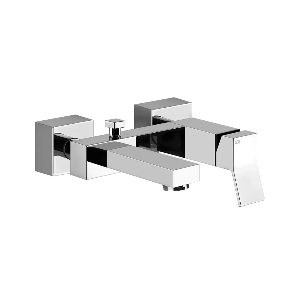 External bath mixer with automatic bath/shower diverter. Gessi dares to move beyond usual and strengthened, crushing the shape of Rettangolo with an oblique cut, a diagonal line breaking it and changing its silhouette, reshaping its iconic outline evoking a “K”. The result is astonishing: the object preserves its original harmony, but it is new, different and beautiful.