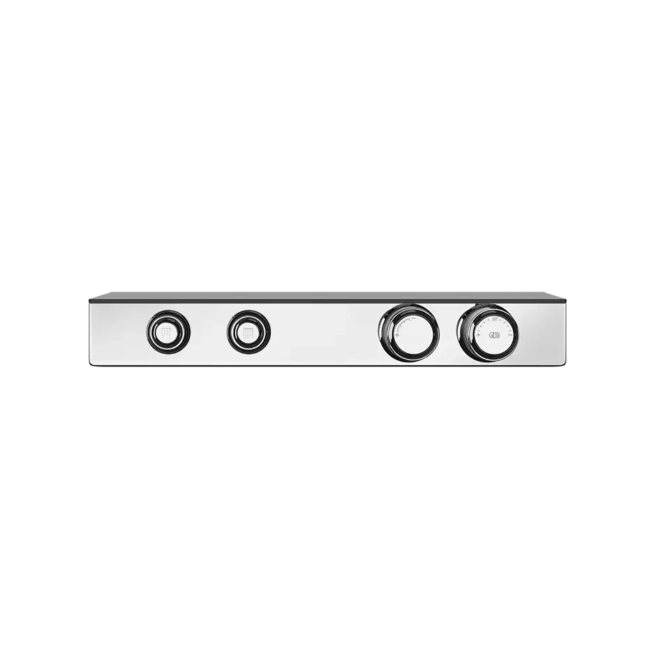 External parts for thermostatic shelf mixer for two simultaneous functions, with push-botton on/off controls. Hi-Fi Eclectic is an evolution of the original Hi-Fi concept: a high-design multifunctional shower control with shapes and features that remind us of the panels, graphics, keys and knobs of the high fidelity stereo systems that made a deep mark in the history of design and technology.
