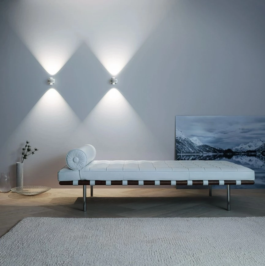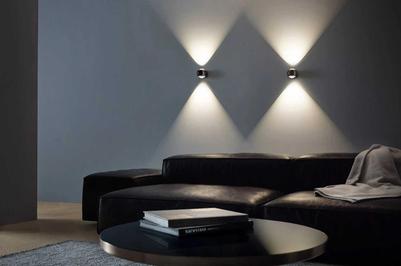 It doesn't take much to design the ideal wall lighting. You just have to strip everything back until you're left with perfection – as with io verticale. Its double-sided, conical light is legendary. A constantly changeable, geometrically shaped light play that gives walls in corridors and living areas a new radiance. Thanks to an innovative magnetic fastening, the lens can be removed with a simple twist and customized with up to two optical inserts. This enables you to tailor the lighting effect to the situation.