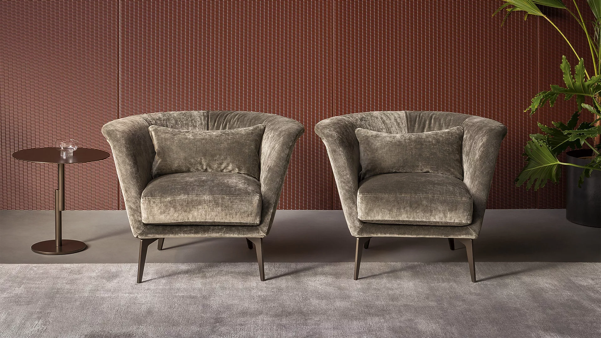 Lovy armchair has a semi-oval shape, which invitesconversation and creates movement from a visual point