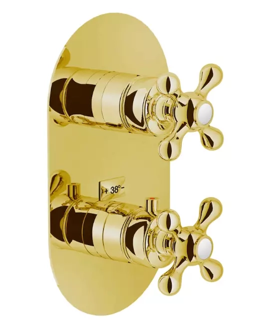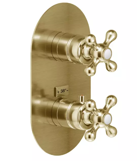 Pattern of contrasts in vintage style. Sensations of pleasant tranquillity. Peace and well-being from a distant past: the Grazia collection brings back the charm and appeal of ancient times, mixing a marked 20th century style with the most modern technological innovation of our brand.FLUSH FIT THERMOSTATIC MIXER, 2-WAYS EXTERNAL PART. 38° C safety cut-out