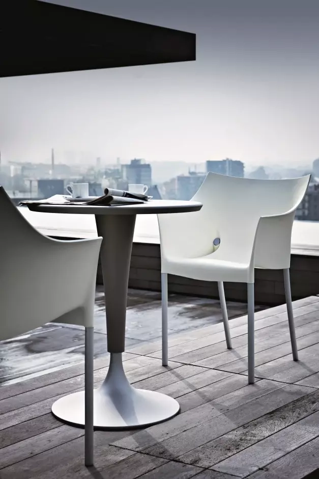 The Dr. NO chair is combined with a round table, Dr. NA, available as a direct complement to the seat. The scratch-proof painted surface and tapered central leg made of plastic and aluminium let Dr. NA live separately with the small armchair to form an ideal dual concept.