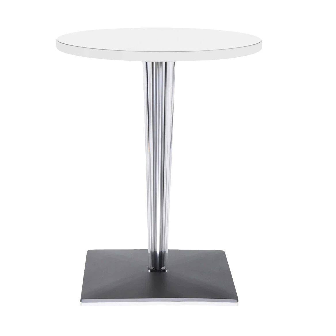 The TopTop table line is distinguished by its leg which can be either a round or square transparent section with a multi-faceted surface and metal core.