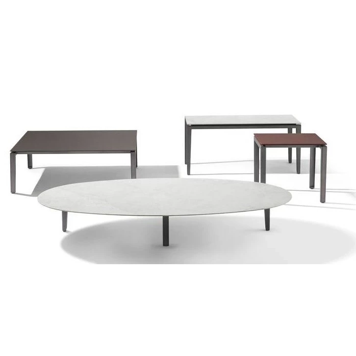 A collection of square, oval and rectangular side tables of different sizes and heights. Metal base, matt enamelled in the colours anthracite grey or chestnut brown. The tops are available in white Carrara marble, black Marquiña marble or in red brick or coffee-coloured glass.