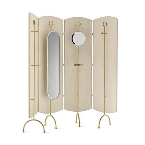 Screen composed of 4 modules in curved wood inlaid in Frisè Color Walnut or dark gray Frisé Maple. Interior in white Frisè Tanganika. Structure and accessories in satin brass with 6mm extralight bevelled mirrors. Satin brass bowl with suede covered bottom.
