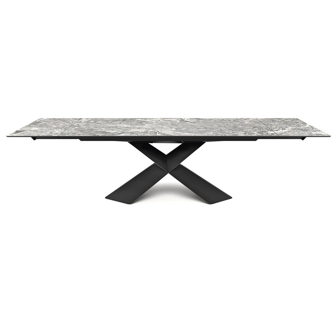 Extendible table with base in titanium (GFM11), bronze (GFM18), graphite (GFM69) or black (GFM73) embossed lacquered steel, Brushed Bronze or Brushed Grey. Marmi ceramic in Alabastro (KM02), Supreme (KM03), Ardesia (KM04), matt Golden Calacatta (KM05), glossy Golden Calacatta (KM06), matt Portoro (KM07), glossy Portoro (KM08), glossy Sahara Noir (KM09), Emperador (KM10), Makalu (KM11), Breccia (KM12) or Arenal (KM13) ceramic top.