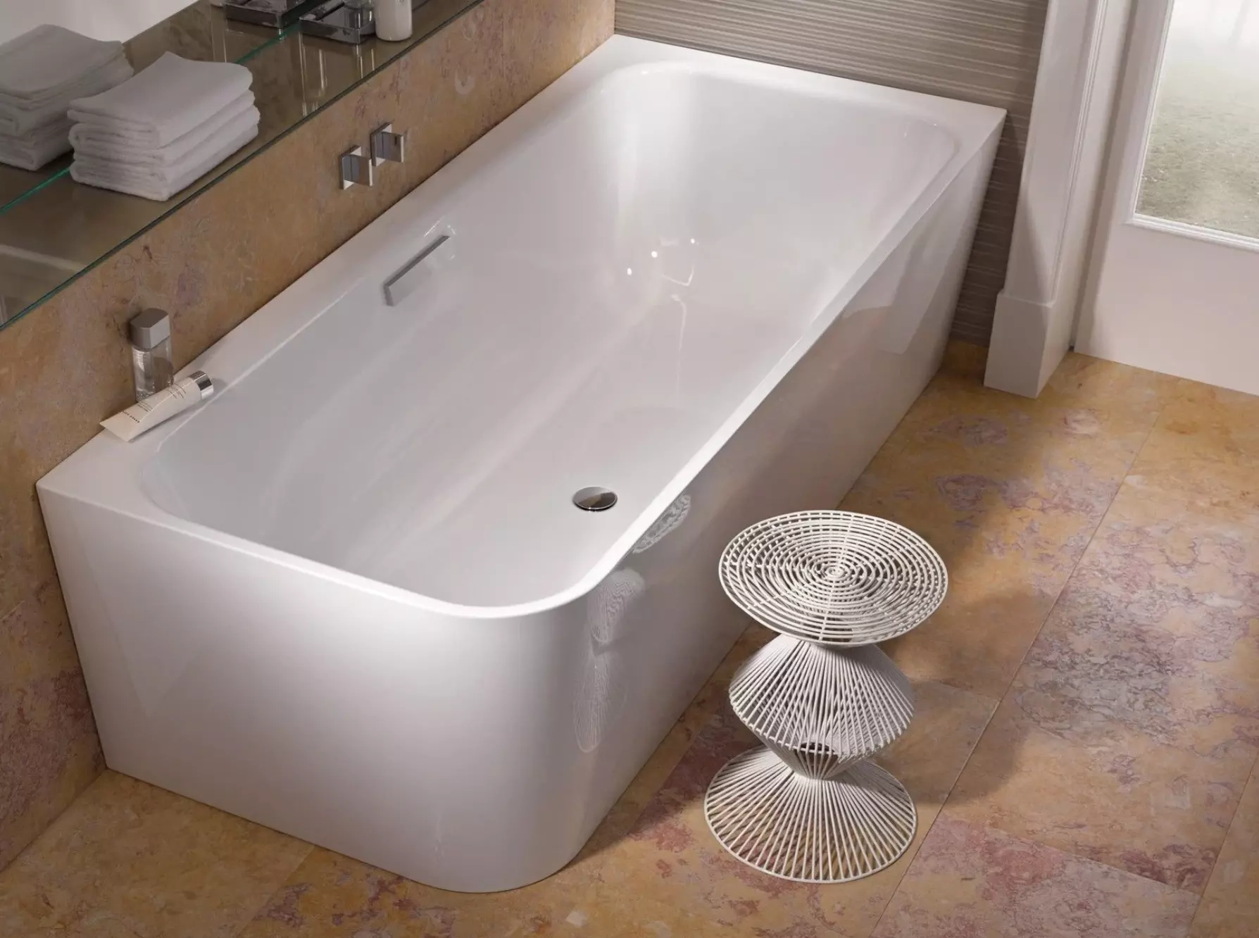Le raccord spécial de vidange et de trop-plein BetteArt ou BetteSensory est obligatoire pour l'installation. Le trop-plein BetteArt est préinstallé. Si vous le commandez avec le système de vidange Trio, le bain est livré avec un tube Sanfix préinstallé pour l'approvisionnement en eau. Un tuyau de vidange flexible est généralement inclus dans la livraison.