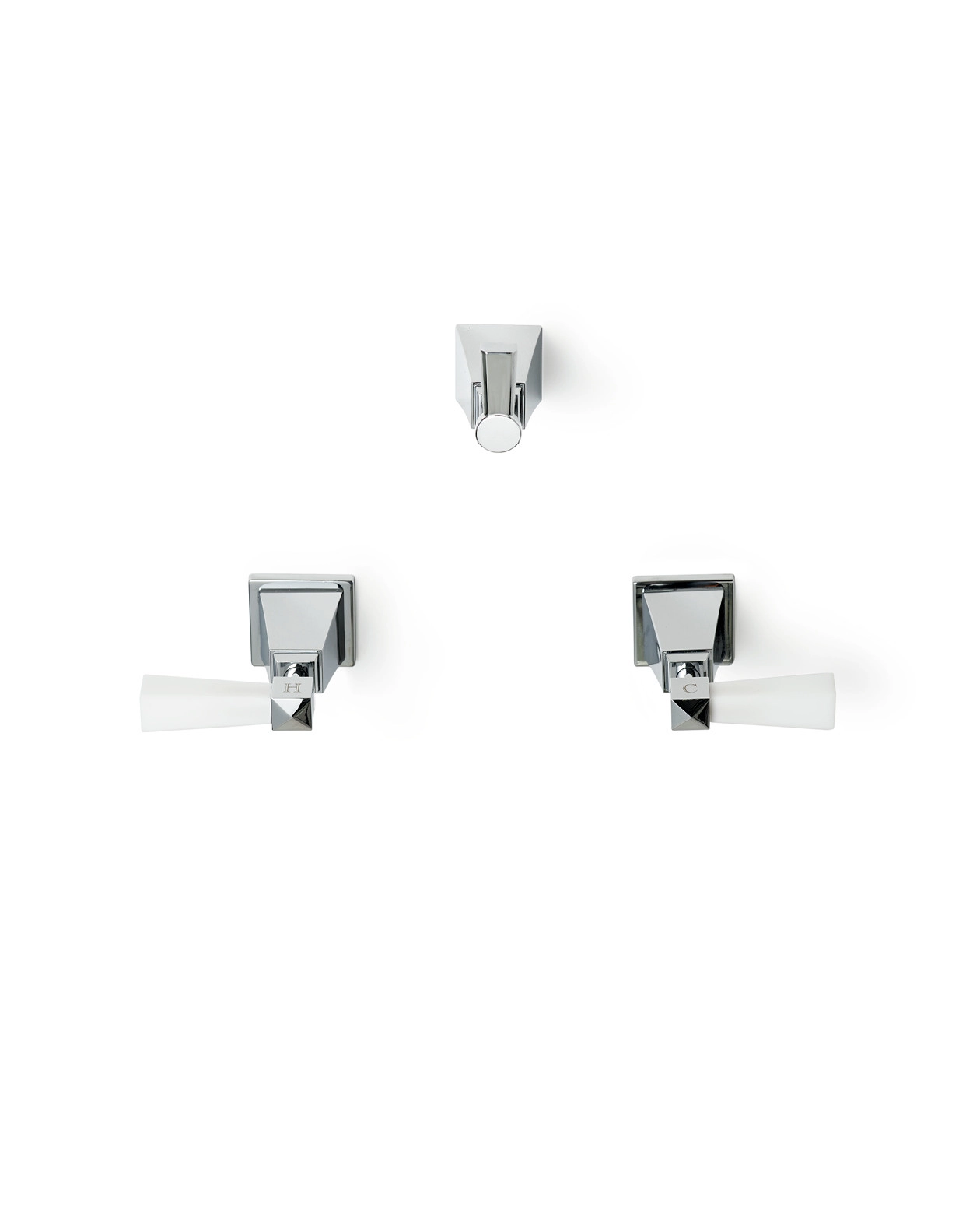 Une paire de robinets coupés caractérisée par un design raffiné et des lignes géométriques rigoureuses inspirées des années 1930. Cette collection présente des leviers de pyramide tronquée en laiton noir poli ou blanc mat ou en métal. Ils sont disponibles dans les finitions suivantes : chrome, nickel poli, nickel satiné et or clair.