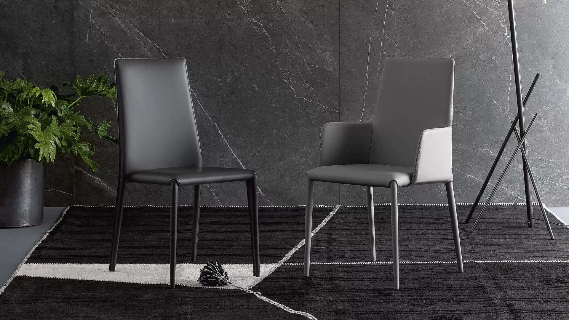 Élégante et raffinée, Eral est une chaise rembourrée avec un dossier haut qui la rend particulièrement confortable et adaptée à tous les environnements et à tous les styles. Elle est entièrement rembourrée de cuir, d'éco-cuir ou de cuir émeri ou dans la version avec des pieds en métal peint, disponibles dans diverses couleurs, permettant de créer des combinaisons ton sur ton ou des contrastes intéressants avec la partie rembourrée. Confortable et possédant une grande élégance, Eral a été conçue avec une modernité discrète, qui lui permet de dialoguer avec différents goûts et mondes. Dans la variante entièrement rembourrée, cette chaise donne un effet d'unité élevée et de compacité stylistique, toujours équilibrée de manière agréable: une approche précieuse et raffinée de la fonctionnalité.