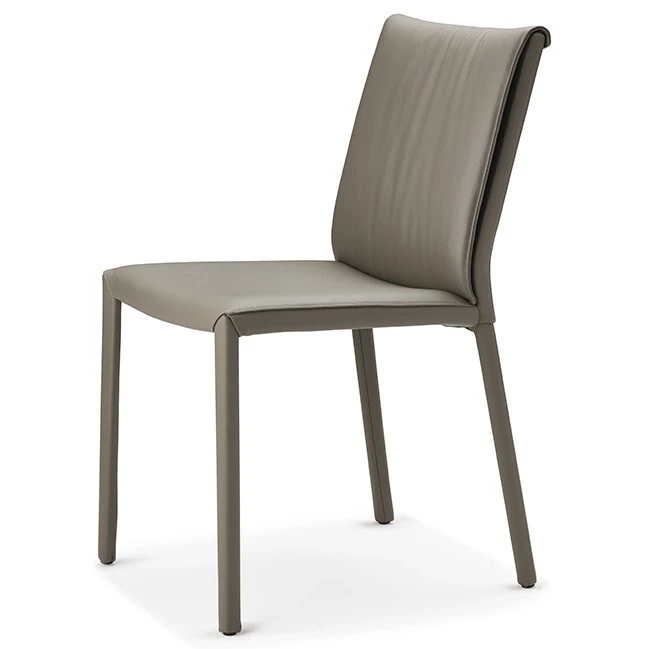 Chaise avec ou sans accoudoirs avec structure en acier entièrement recouverte de tissu, nubuck synthétique, micro-nubuck, cuir synthétique ou cuir souple selon la carte d'échantillons. Housse du dossier matelassée. La housse n'est pas amovible.